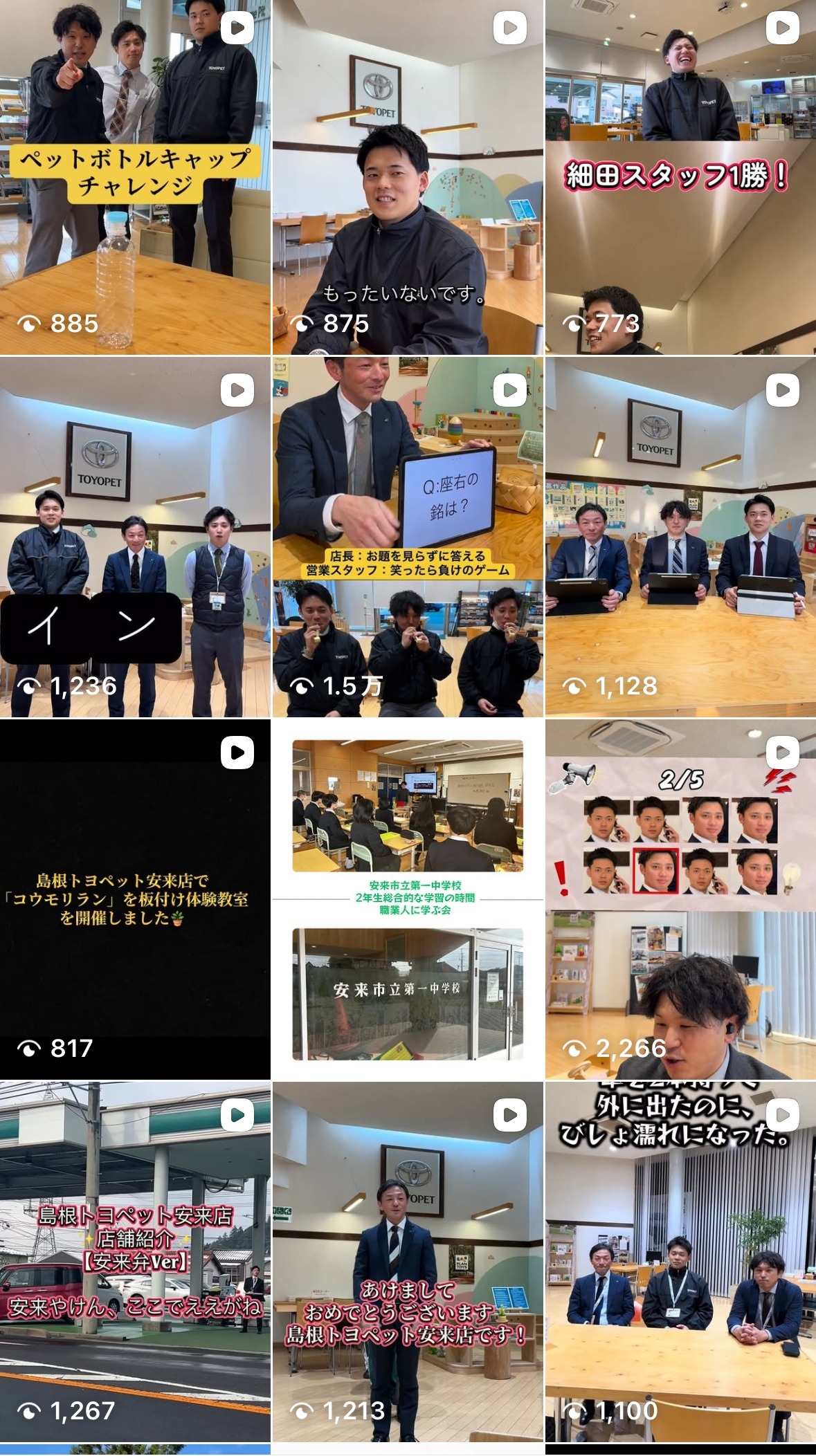 営業スタッフを中心に、さまざまな投稿を行っており、車の情報だけではなく、見た方に楽しんでいただけるよう工夫を凝らして日々がんばっております!Instagramを通して島根トヨペットの雰囲気を知っていただき、より身近に感じていただけると嬉しいです!